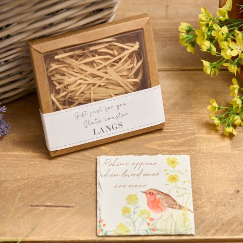 ROBINS APPEAR WHEN LOVED ONES ARE NEAR SLATE COASTER WITH GIFT BOX **