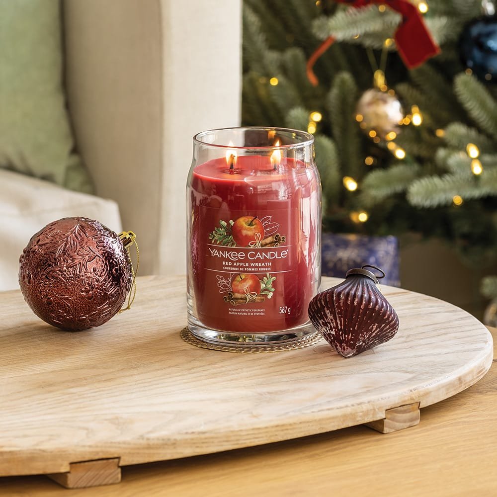 A happy holiday homecoming with the festive aroma of sweet apples, cinnamon, walnuts and maple. Top Note: Golden apples, cinnamon leaf, clove Middle Note: Apple peel, cracked walnuts, brown sugar Base Note: Amber, melted butter, maple syrup, vanilla. Experience the Yankee Candle? brand, totally reimagined. This refreshing take on our iconic Jar shape is designed to create the best experience to date. This is the largest Jar Candle in the collection at 567g. Two wicks and a premium soy-wax blend provide beautiful ambiance. Hand-illustrated labels and vibrant wax colours are perfectly matched with our Signature exclusive and tried-and-true fragrances to create an inspired addition to your home.